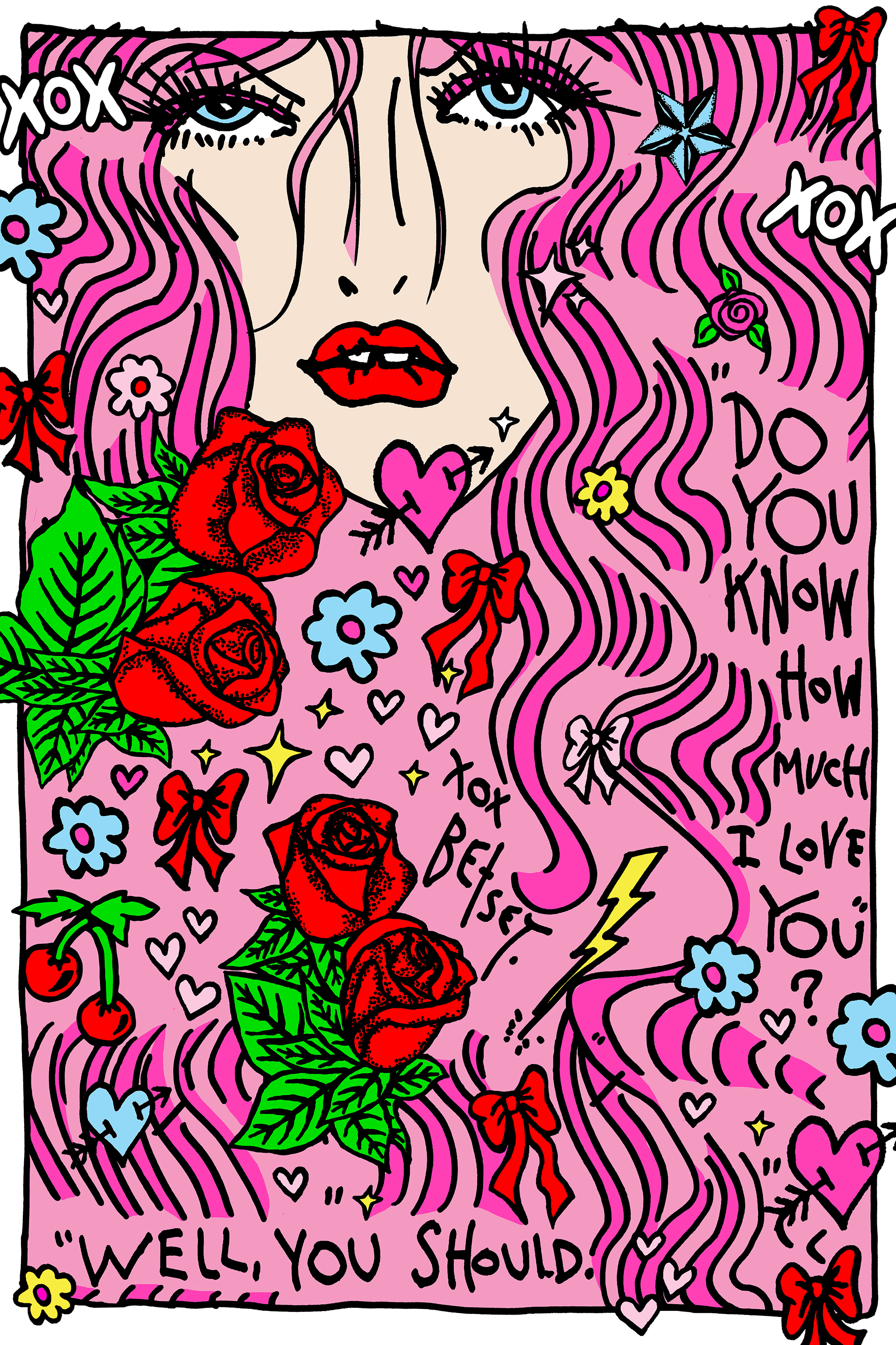 Illustrated icons for Betsey Johnson’s 80th birthday cotton lycra collection. Graphics are taken from Betsey’s original print artwork. Printed as stickers placed on a skateboard as a prop for photoshoots.